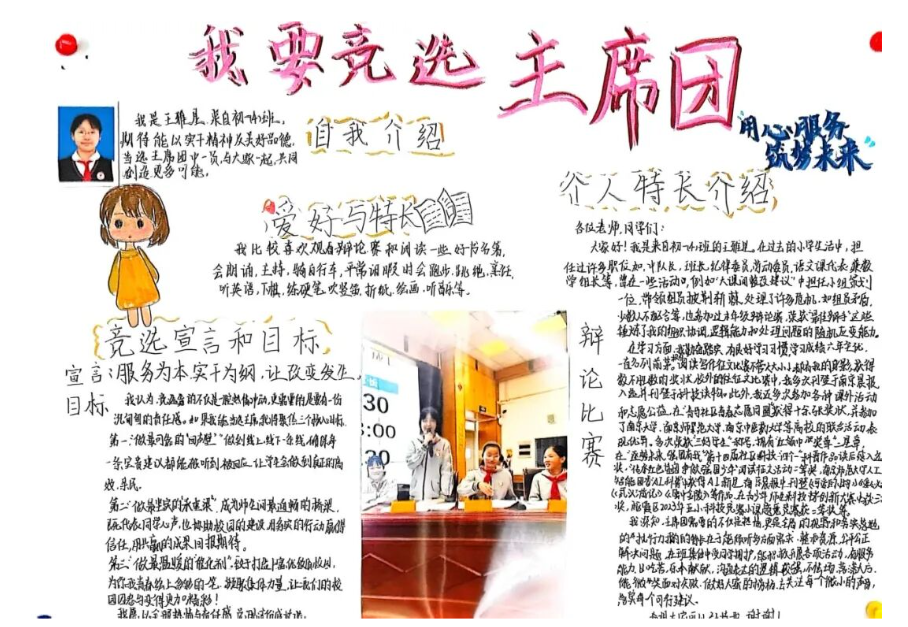 9月17日至22日,学校一楼展厅化身为一道亮丽的风景线——候选人竞选小报集中展示。海报上,不仅有候选人们阳光自信的个人照片、清晰明了的竞选目标,更用画笔生动勾勒出他们的兴趣爱好与服务热情。这一张张小小的海报,成为了同学们展示自我、连接彼此的独特窗口。