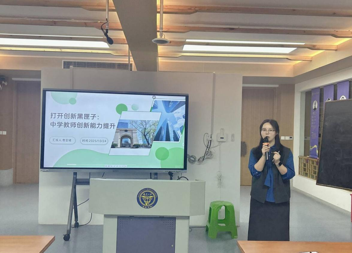 随后,浙江师范大学教育学博士曹亚珺老师为青年教师带来题为《打开创新黑匣子:中学教师创新能力提升》的专题讲座。开场环节,曹老师先组织在场教师开展了创新力提升主题团体辅导。过程中,老师们积极参与、踊跃发言,现场气氛热烈,思维迸发阵阵火花。